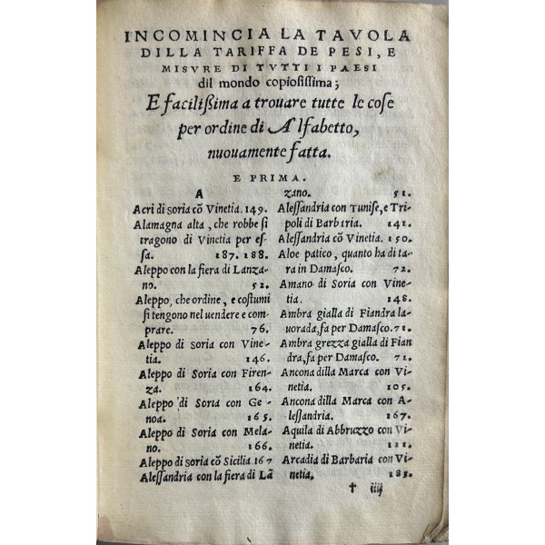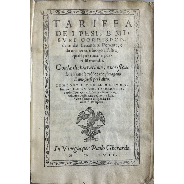 Tariffa de i pesi, e misure corrispondenti dal Levante al Ponente, e da una terra, e luogo all'altro, quasi per tutte le parti del mondo. Con la dichiaratione, e notificatione di tutte le robbe: che si tragono di uno paese per l'altro