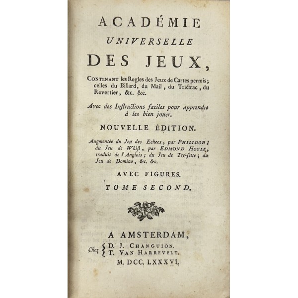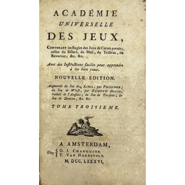 Academie universelle des jeux, Contenant les Regles des Jeux de Cartes permis; celles du Billard, du Mail, du Trictac, du Revertier, &c. &c. Avec des Instructions faciles pour apprendre à les bien jouer. Nouvelle edition augmentee du Jeu des Echecs, par Philidor, du Jeu de Whist par Edmond Hoyle, traduit de l'Anglois, du jeu de Tre-sette, du Jeu de Domino, &c. &c.