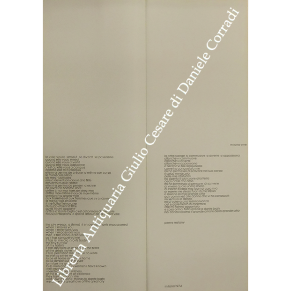 Milano vive. Una idea realizzata con personale interpretazione da fotografie di Renzo Molteni, Sergio Ortolani, Sandro Passaretti e da ritratti di Luciano Ferri. Presentazione di Piero Bassetti. Leggenda di Pierre Restany