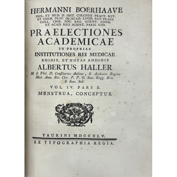 Praelectiones academicae in proprias institutiones rei medicae edidit et notas addidit Albertus Haller in hac editione. Adjectus est integer institutionum medicarum.. Vol. I - Chylificatio, arteria, cor, pulmo, sanguis; Vol. II - Glandula, cerebrum, lien, hepar, musculi, cutis, nutritio; Vol. III - Sensus externi, interni, somnus; Vol. IV, parte I - Respiratio, loquela, semen, masculinum; Vol. IV, parte II - Menstrua, conceptus; Vol. V - Pathologia, semeiotice, hyghiene, therapeutice. Accedit index totius operis