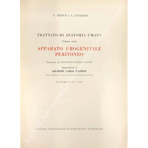 Trattato di anatomia umana. Vol. I - Osteologia - Artrologia. Traduzione di Giovanni Ciardi-Duprè. Aggiornamento di Giovanni Giordano-Lanza, con 777 figure in nero e a colori; Vol. II - Miologia-Angiologia. Aggiornamento di Giovanni Giordano-Lanza, con 879 figure in nero e a colori; Vol. III - Sistema nervoso centrale. Traduzione e aggiornamento di Lorenzo Bianchi. Ghiandole a secrezione interna. Traduzione e aggiornamento di Enrico Allara, con 729 figure in nero e a colori; Vol. IV - Sistema nervoso perifirico. Traduzione e aggiornamento di Lorenzo Bianchi. Organi dei sensi. Aggiornamento di Damiano Zaccheo, con 806 figure in nero e a colori; Vol. V - Apparato della respirazione e della fonazione. Traduzione e aggiornamento di Lorenzo Bianchi e Enrico Allara. Apparato della digestione. Traduzione e aggiornamento di Enrico Allara e Giuseppe Carlo Balboni, con 872 figure in nero e a colori; Vol. VI - Apparato urogenitale peritoneo. Traduzione di Giovanni Ciardi-Duprè. Aggiornamento di Giuseppe Carlo Balboni, con 696 figure in nero e a colori; Indice analitico generale del trattato di anatomia umana, anatomia descrittiva e microscopica - Organogenesi