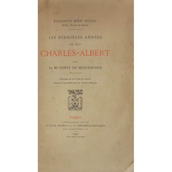 Tavola raffigurante il Re Carlo Alberto ad inizio volume. In testa al frontespizio Epilogue d'un Regne Milan Novare et Oporto.